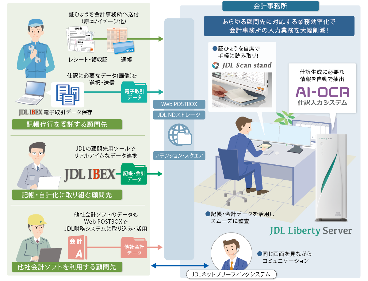 顧問先訪問時に、JDL Liberty Note 2とWi-Fiハンディスキャナーを携行すれば、証ひょうの読み取りから会計事務所への送信、JDL AIによる仕訳生成、監査、顧問先への解説までを、一度の訪問で完結。顧問先への訪問にかかる、移動時間や交通費などのコストを削減できます。